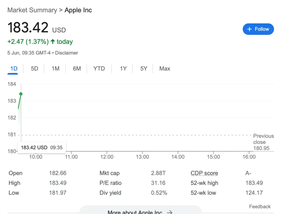 Appleの株価(AAPL)は本日、iOS 17、新型Mac、初の複合現実ヘッドセットデバイスの発表が予想される本日のWWDC基調講演を前に、史上最高値の183.49ドルを超えた。